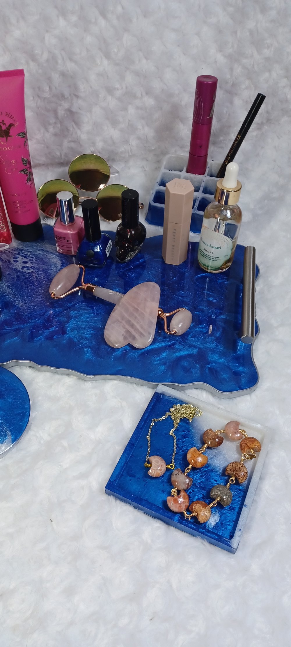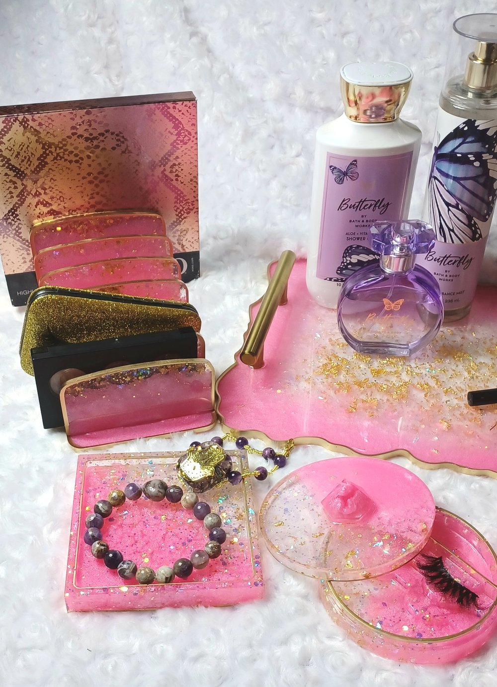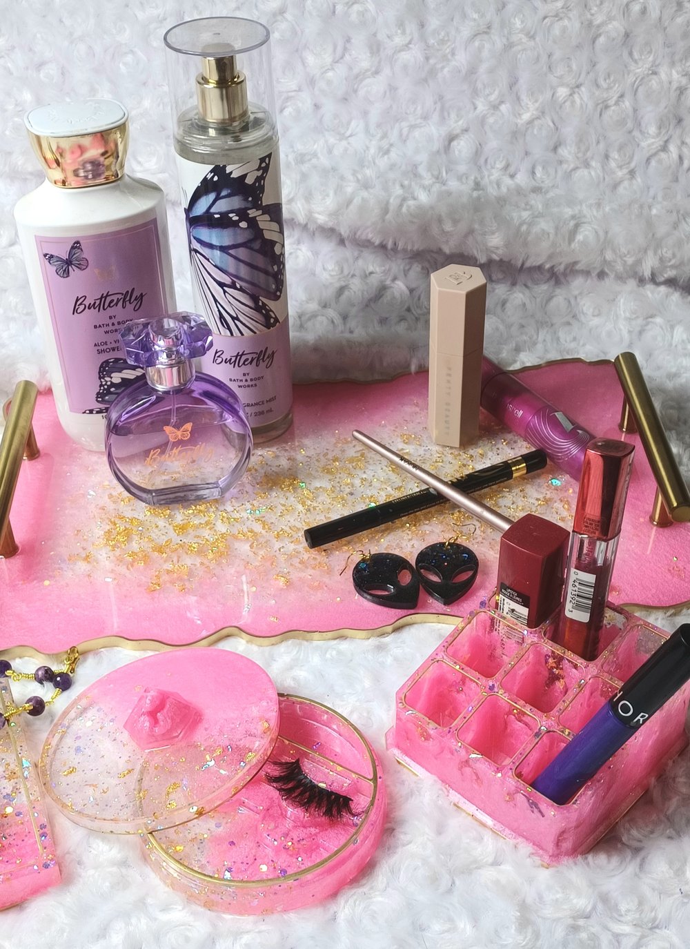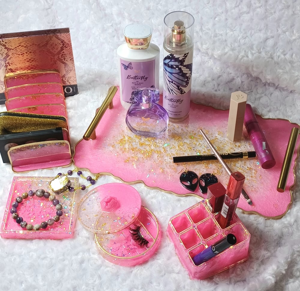 Rose Quartz colored with gold trim. Come with Vanity tray, Compact makeup separation stand, eyelashe case, Trinket dish, and Lipstick holder. Custom color is also available.