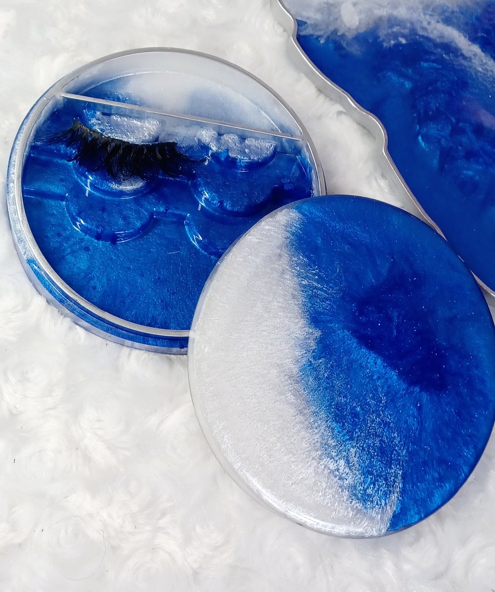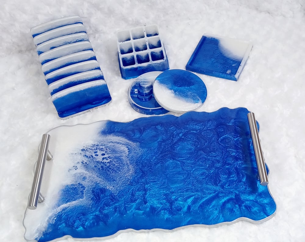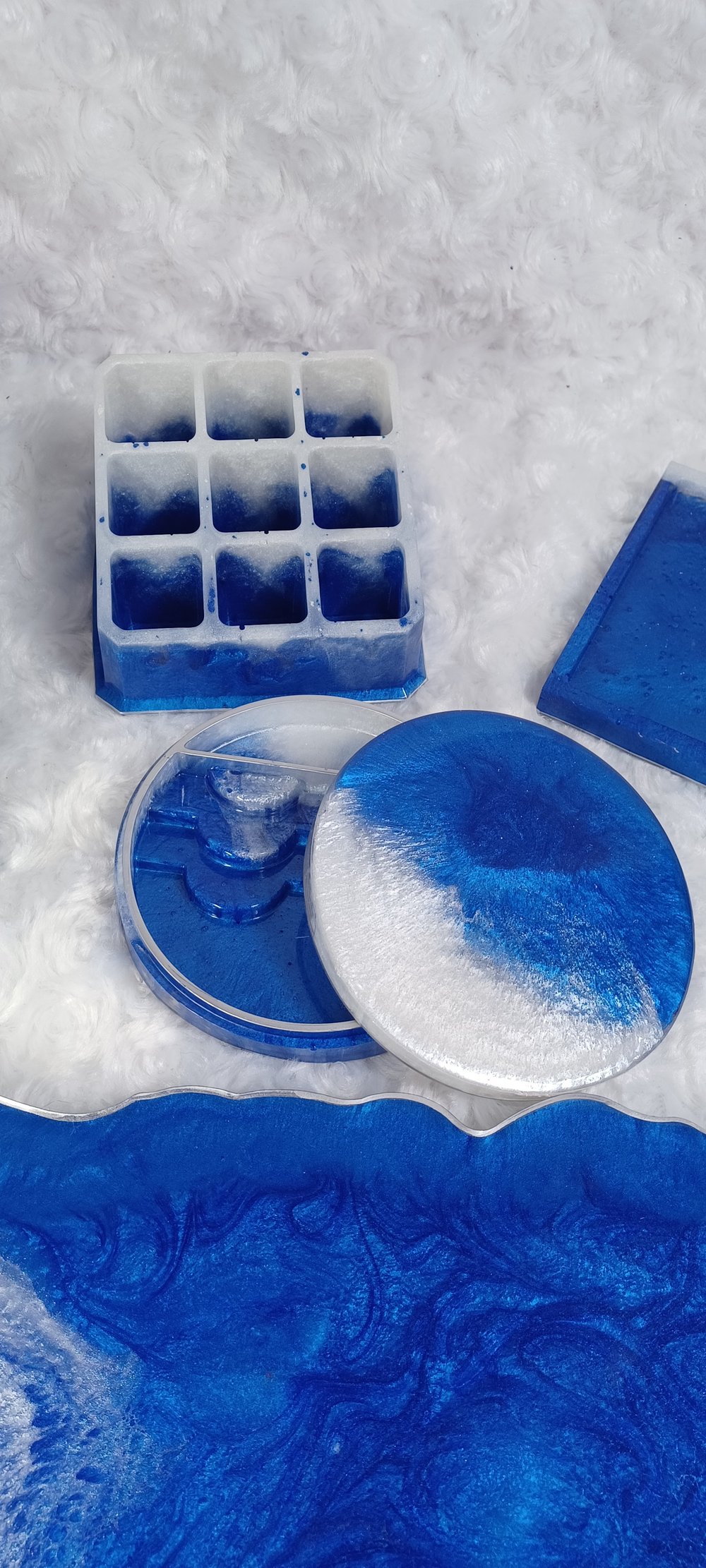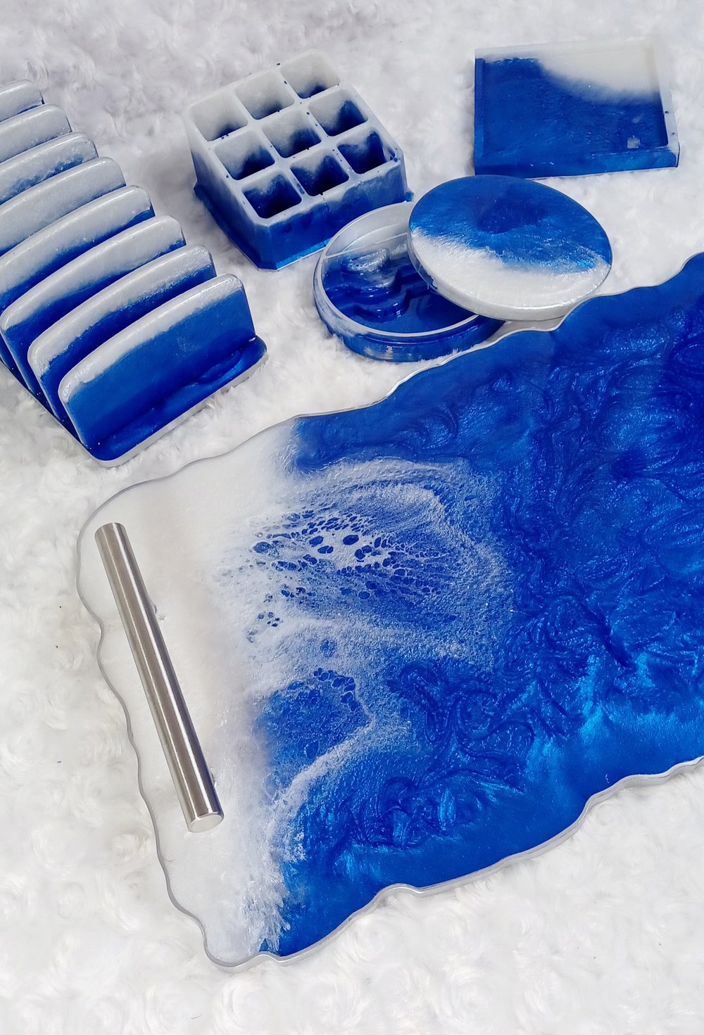 Rose Quartz colored with gold trim. Come with Vanity tray, Compact makeup separation stand, eyelashe case, Trinket dish, and Lipstick holder. Custom color is also available.