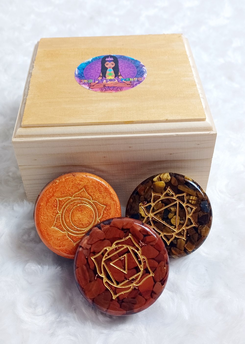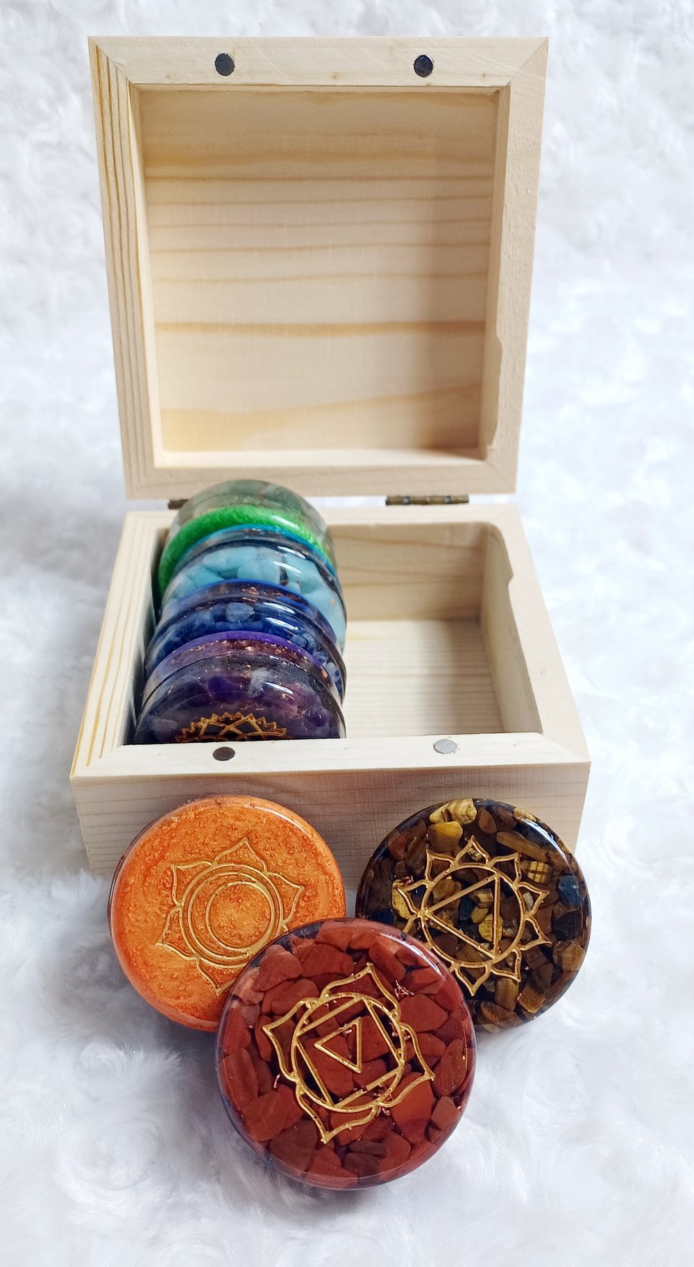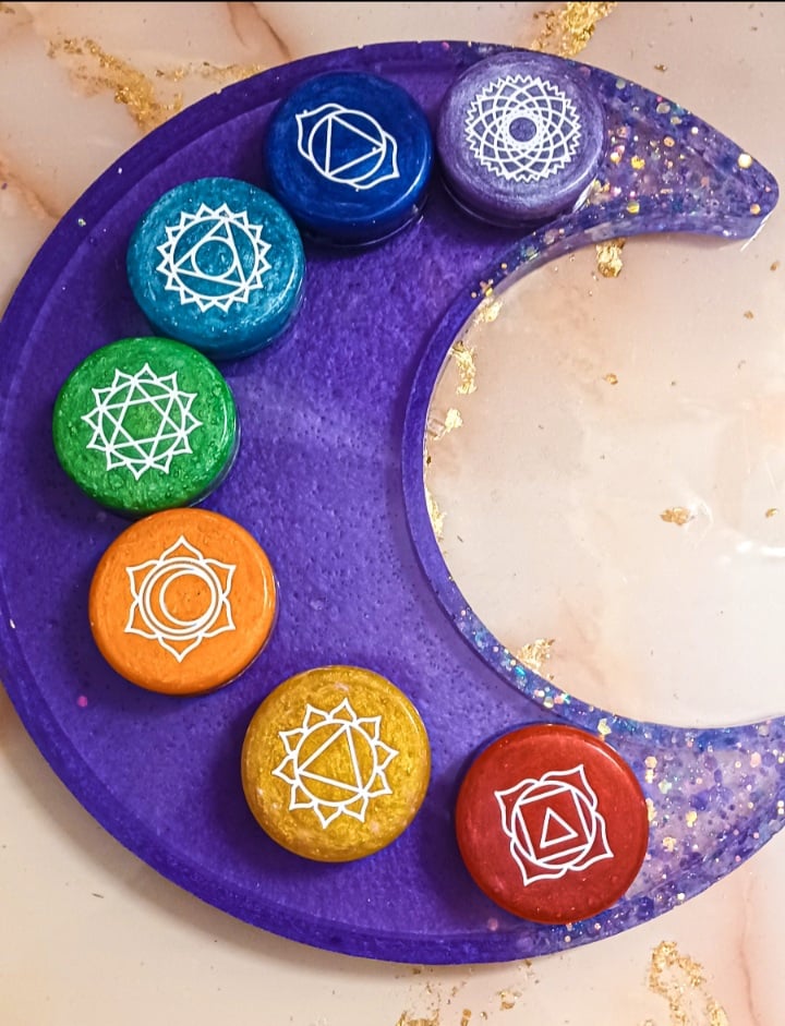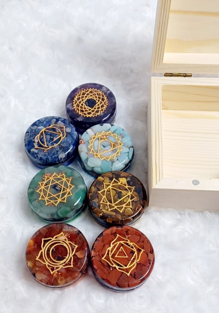 Chakra tablets are made of resin, grade A Amethyst, lapis lazuli or sodalite, Amazonite, Aventurine, tiger's eye or citrine, fire quartz, and Red Jasper paired with magnetic iron oxide, Shungite chip, Shungite powder, copper coil and copper chips. Place these tablets on the chakra points during meditation or self reiki.