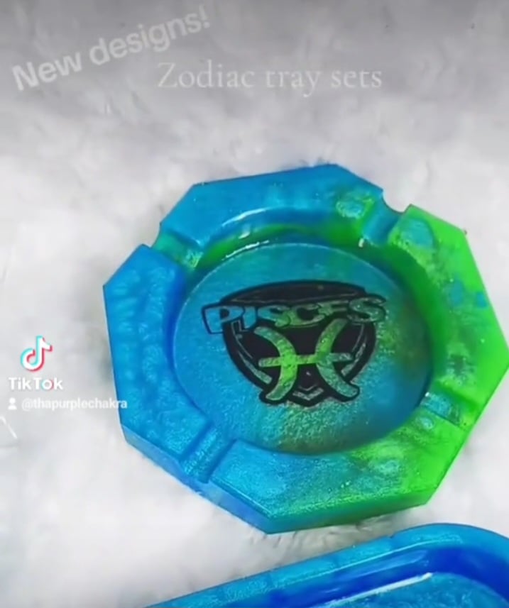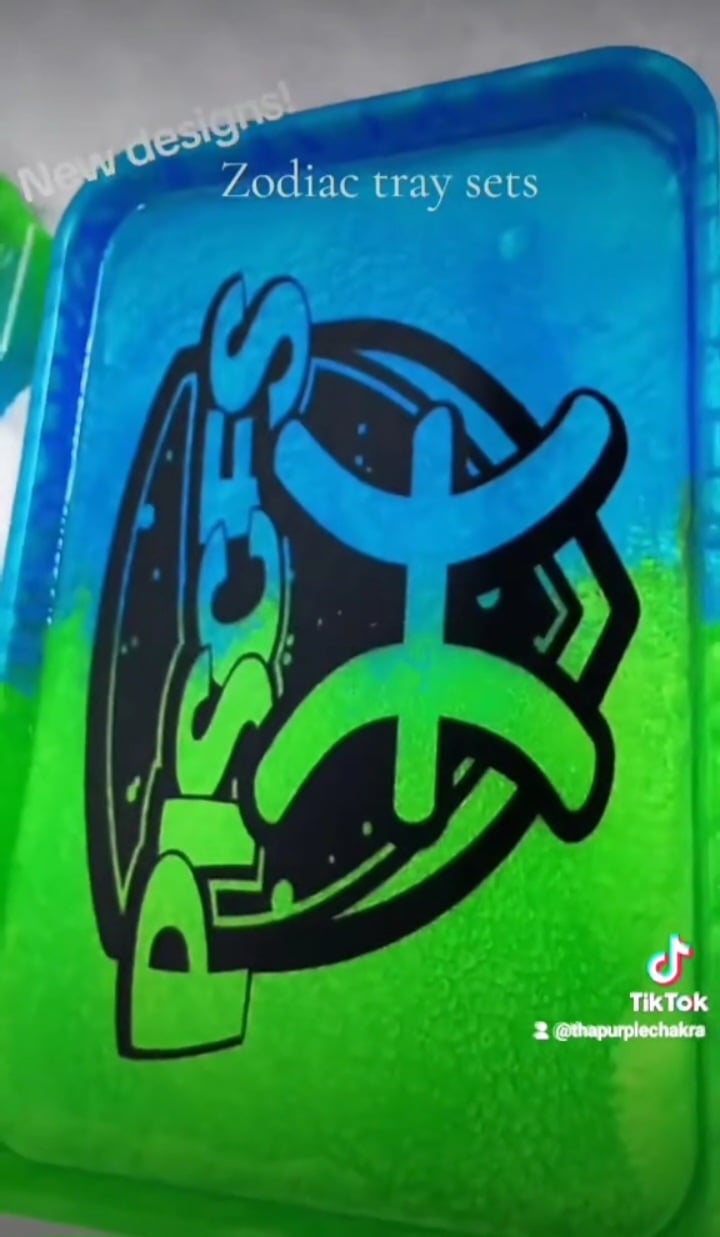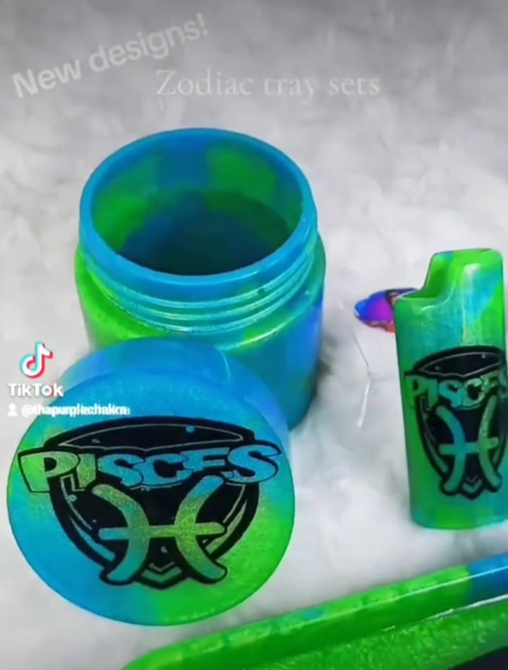 Comes with tray, lighter case, ash tray, and a stash jar.. (leave not at checkout for custom color at no extra charge) If no note is left, zodiac trays will be made in the colors that coincide with each zodiac.