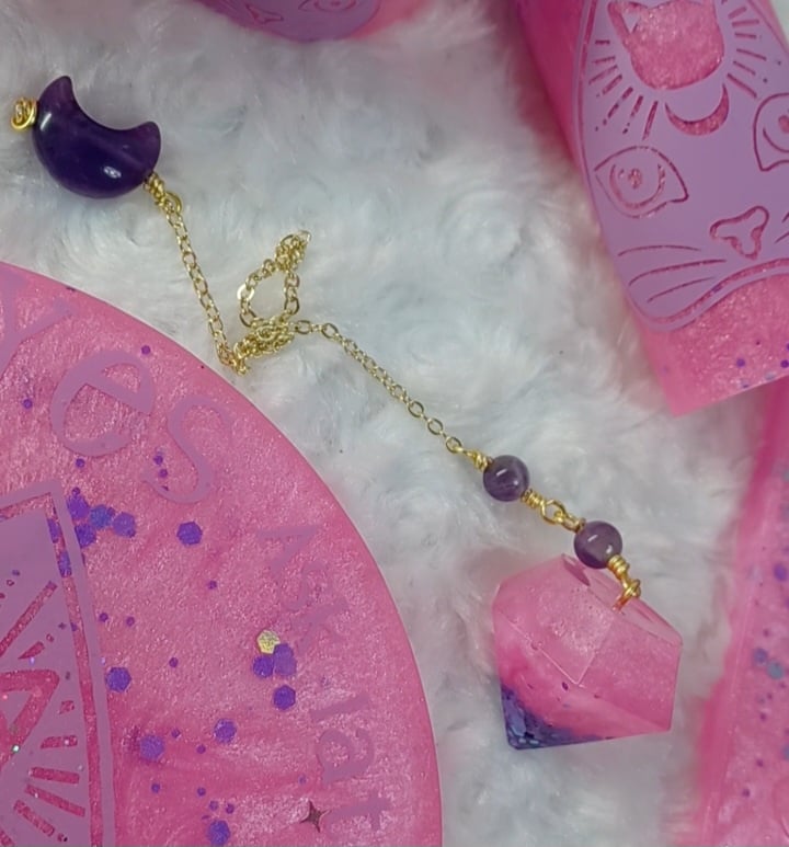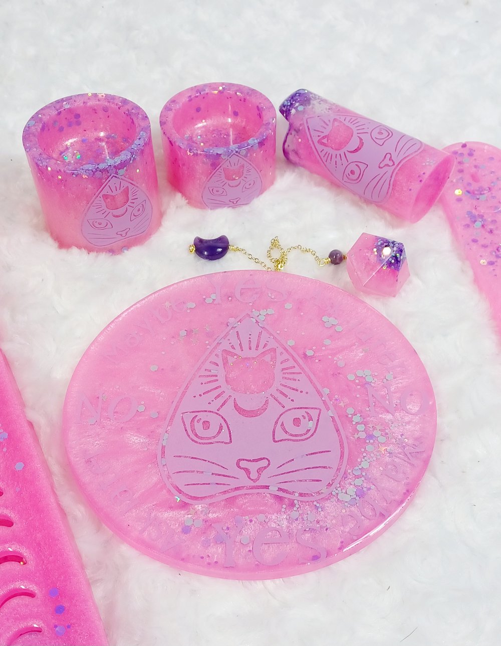 The set comes with two tea light holders, an insence stand, an insence box, pendulum, and pendulum board.
