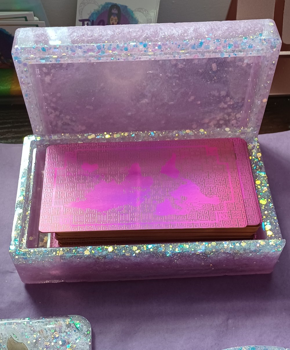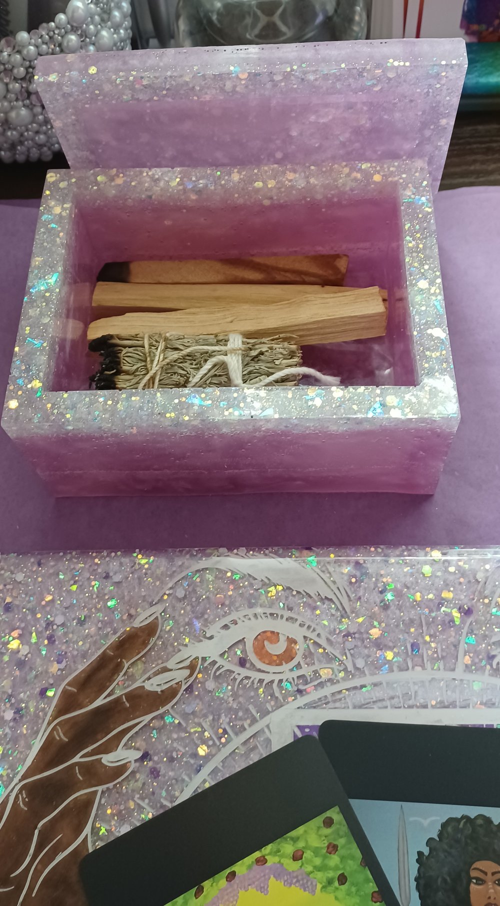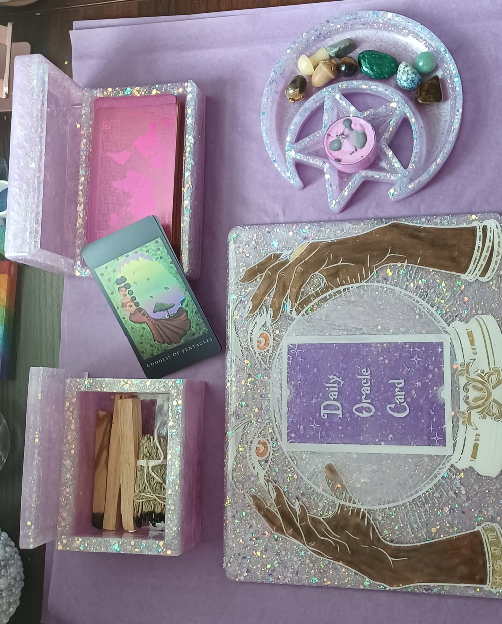 Set comes with Tarot box, tarot tray, sage box, and crystal tea light holder. (Remember you can always customize to your liking just leave colors selection in the notes at checkout.)