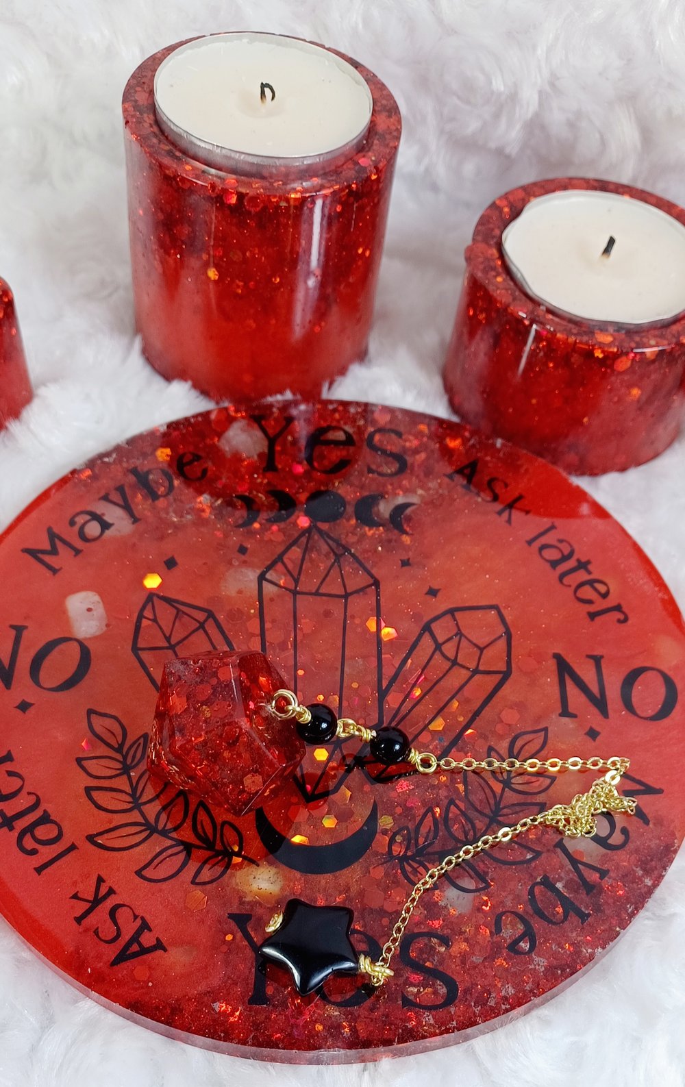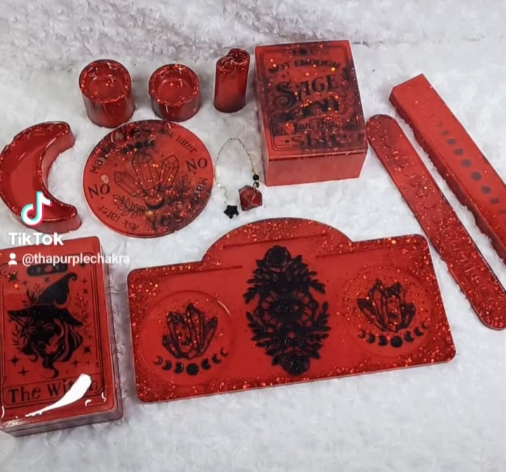 Ruby Moon set come in the color Ruby red and black. This set contains a Tarot Board to hold cards upright, a Tarot Card Box that fits standard size Tarot cards, a sage box to hold smudging tools, a pendulum board with matching pendulum both have mini clear quartzstones and copper chips for charging and added energy, two tea light candle holders, incense holder, incense burner, a sage ashtray and a lighter case.